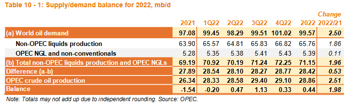 По сравнению с теми же кварталами 2021 г., спрос на нефть ОПЕК в первом и втором кварталах по оценкам, выше на 2,4 и 1.3 млн б/д, а в третьем и четвертом на 0,3 млн и 1,2 млн б/д соответственно.