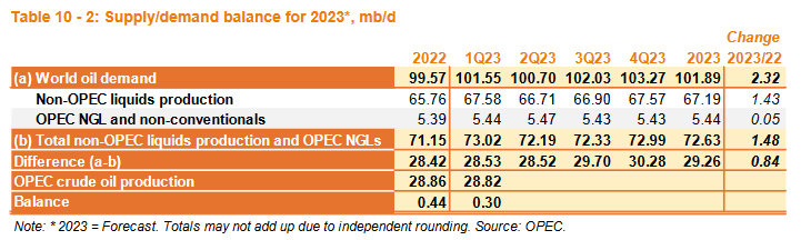 Спрос на нефть ОПЕК в 2023 году не изменился по сравнению с предыдущей оценкой и составил 29,3 млн б/д. Это примерно на 0,8 млн б/д выше, чем в 2022 году.