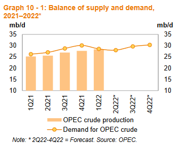 Спрос на нефть ОПЕК в 2022 году не изменился по сравнению с предыдущим месяцем и составил 29,1 млн б/д, что примерно на 1,0 млн б/д выше, чем в 2021 году. По сравнению с предыдущей оценкой, первый квартал 2022 г был пересмотрен в сторону понижения на 0,2 млн б/д. Второй квартал остался без изменений по сравнению с предыдущим месяцем, в то время как третий и четвертый кварталы были пересмотрены в сторону понижения примерно на 0,2 млн б/д каждый. По сравнению с теми же кварталами 2021 г., спрос на нефть ОПЕК в первом, втором и третьем кварталах по прогнозам, будет выше на 2,3 млн б/д, 0,1 млн б/д и 0.8 млн б/д. Согласно вторичным источникам, добыча нефти ОПЕК в среднем составляла 28,4 млн б/д в первом квартале 2022 г., что на 0,2 млн б/д ниже спроса на нефть ОПЕК.