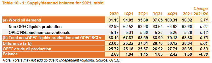Таблица 10-1: Баланс на рынке нефти в 2021, млн баррелей в день