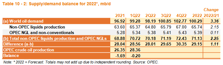 Спрос на нефть ОПЕК в 2021 году был пересмотрен вниз на 0,2 млн баррелей в день (б/д) по сравнению с предыдущим отчетом и остался на уровне 28,0 млн б/д. Это примерно на 5,0 млн б/д выше, чем в 2020 году. Согласно вторичным источникам, добыча нефти ОПЕК в среднем составляла 25,2 млн б/д в первом квартале 2021 года, что на 1,0 млн б/д ниже спроса на нефть ОПЕК за тот же период. Во втором квартале 2021 г. добыча нефти ОПЕК в среднем составила 25,6 млн б/д, что на 1,4 млн б/д ниже спроса на нефть ОПЕК. В третьем квартале добыча сырой нефти ОПЕК в среднем составлял 26,9 млн б/д, что на 1,8 млн б/д ниже спроса на нефть ОПЕК. В четвертом квартале сырая нефть ОПЕК добыча в среднем составила 27,7 млн б/д, что на 2,4 млн б/д ниже спроса на нефть ОПЕК. В 2021 году добыча нефти ОПЕК в среднем составила 26,4 млн б/д, что на 1,7 млн б/д ниже спроса на нефть ОПЕК. Спрос на нефть ОПЕК в 2022 г. остался неизменным по сравнению с предыдущим месяцем и составил 29,1 млн б/д., что примерно на 1,0 млн б/д выше, чем в 2021 г. Согласно вторичным источникам, добыча нефти ОПЕК в среднем составляла 28,4 млн б/д. Это на 0,2 млн б/д ниже спроса на нефть ОПЕК.