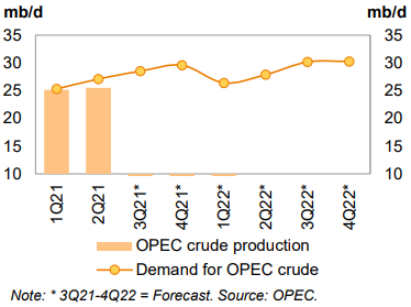 Спрос на нефть стран участниц ОПЕК в 2021 остался неизменным с предыдущего месяца и составил 27,7 млн баррелей в сутки, что примерно на 5,0 млн баррелей в сутки выше, чем в 2020 году. Согласно вторичным источникам, добыча нефти странами ОПЕК в первом квартале 2021 составила в среднем 25,1 млн баррелей в сутки , что на 0,2 млн баррелей в сутки ниже, чем спрос на нефть стран ОПЕК за аналогичный период. Во втором квартале 2021 добыча нефти странами ОПЕК составила в среднем 25,5 млн баррелей в сутки, что на 1,6 млн баррелей в сутки ниже, чем показатель спроса.