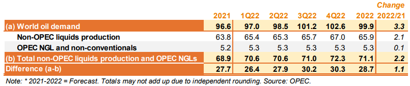 Исходя из первого прогноза мирового спроса на нефть и предложения в странах, не входящих в ОПЕК, в 2022 году ожидается, что спрос на нефть стран ОПЕК достигнет 28,7 млн ​​баррелей в сутки, что на 1,1 млн баррелей в сутки выше уровня 2021 года. Сравнивая с аналогичными кварталами за 2021 год, ожидается  увеличение спроса на нефть стран ОПЕК в первом и втором кварталах 2022 года на 1,1 и на 0,8 млн баррелей в сутки соответственно. В третьем и четвертом кварталах 2022 года так же предполагается рост спроса на 1,7 и 0,7 млн баррелей в сутки соответственно.