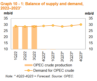 Согласно вторичным источникам, добыча нефти ОПЕК в среднем составляла 28,4 млн б/д в первом квартале 2022 г., что на 0,3 млн б/д ниже спроса на нефть ОПЕК. Во втором квартале 2022 года добыча нефти ОПЕК в среднем составляла 28,6 млн б/д, что на 0,2 млн б/д превышает спрос на нефть ОПЕК. В третьем квартале 2022 года добыча сырой нефти ОПЕК в среднем составила 29,5 млн б/д, что на 1,1 млн б/д выше спроса на нефть ОПЕК.
