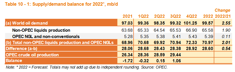 Спрос на нефть ОПЕК в 2022 году снижен на 0,1 млн баррелей в день (б/д) по сравнению с оценкой в ​​предыдущем месяце и составит 28,6 млн б/д, что примерно на 0,5 млн б/д выше, чем в 2021 году.