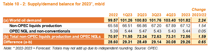 Спрос на нефть ОПЕК в 2023 году также снижен на 0,2 млн б/д по сравнению с предыдущей оценкой и составит 29,3 млн б/д, что примерно на 0,7 млн ​​ б/д выше, чем в 2022 году.