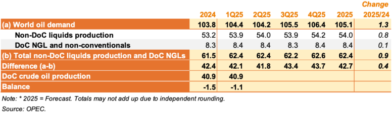 Спрос на нефть DoC (т. е. нефть из стран, участвующих в Декларации о сотрудничестве) пересмотрен в сторону повышения на 0,1 млн баррелей в сутки по сравнению с предыдущим месяцем и составит 42,7 млн баррелей в сутки в 2025 году. Это представляет собой увеличение примерно на 0,4 млн баррелей в сутки по сравнению с оценкой на 2024 год.