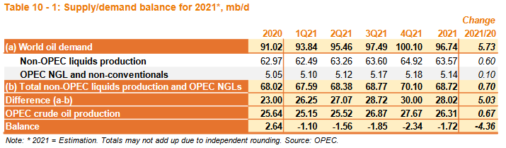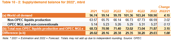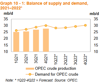 Спрос на нефть ОПЕК в 2021 году был пересмотрен вверх на 0,1 млн баррелей в день (б/д) по сравнению с предыдущим ежемесячным отчётом и составил 28,0 млн б/д, что примерно на 5,0 млн б/д выше, чем в 2020 году. Согласно вторичным источникам, добыча нефти ОПЕК в среднем составляла 25,1 млн б/д в первом квартале 2021 г., что на 1,1 млн б/д ниже спроса на нефть ОПЕК за тот же период. Во втором квартале 2021 года добыча нефти ОПЕК в среднем составляла 25,5 млн б/д, что на 1,6 млн б/д ниже спроса на нефть ОПЕК. В третьем квартале 2021 года добыча сырой нефти ОПЕК в среднем составляла 26,9 млн б/д, что на 1,9 млн б/д ниже спроса на нефть ОПЕК. В четвертом квартале 2021 года добыча сырой нефти ОПЕК в среднем составляла 27,7 млн б/д, что на 2,3 млн б/д ниже спроса на нефть ОПЕК. В течение всего 2021 года добыча нефти ОПЕК в среднем составляла 26,3 млн б/д, что на 1,7 млн б/д ниже спроса на нефть ОПЕК. Спрос на нефть ОПЕК в 2022 году был пересмотрен вверх на 0,1 млн б/д по сравнению с предыдущим месяцем и составил 29,0 млн б/д, что примерно на 1,0 млн б/д выше, чем в 2021 году.