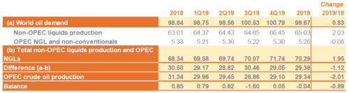 В сравнении с соответствующими четвертями 2018 года, спрос на нефть, добываемую в странах ОПЕК, в первом квартале 2019 года был на 1.9 млн. баррелей в день меньше; во втором квартале — на 1.7 млн. баррелей в день меньше; в третьем квартале — на 0.2 млн. баррелей в день меньше; в четвертом квартале — на 0.7 млн. баррелей в день меньше.