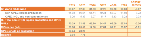 В сравнении с соответствующими четвертями 2019 года, спрос на нефть, добываемую в странах ОПЕК, в первом квартале 2020 года оказался на 8.7 млн. баррелей в день меньше; во втором квартале — на 14.2 млн. баррелей в день меньше; в третьем квартале будет на 2.6 млн. баррелей в день меньше; в четвертом квартале — на 2.2 млн. баррелей в день больше.
