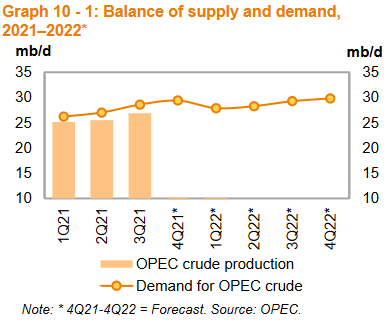 Во втором квартале 2021 года добыча нефти ОПЕК в среднем составляла 25,5 мб/д, что на 1,5 мб/д ниже спроса на нефть ОПЕК. В третьем квартале 2021 года добыча сырой нефти ОПЕК в среднем составляла 26,9 мб/д, что на 1,7 мб/д ниже спроса.