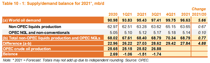 Согласно вторичным источникам, добыча нефти ОПЕК в среднем составляла 25,2 мб/д в первом квартале 2021 года, что на 1,1 мб/д ниже спроса на нефть ОПЕК. Во втором квартале 2021 года добыча нефти ОПЕК в среднем составляла 25,5 мб/д, что на 1,5 мб/д ниже спроса. В третьем квартале 2021 года добыча сырой нефти ОПЕК в среднем составляла 26,9 мб/д, что на 1,7 мб/д ниже спроса на нефть ОПЕК.