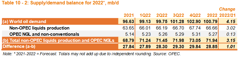 Спрос на нефть ОПЕК в 2022 году также не изменился по сравнению с предыдущим месяцем и составил 28,9 мб/д. Это примерно на 1,0 мб/д выше, чем в 2021 году.