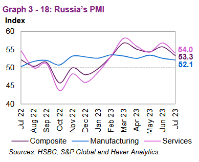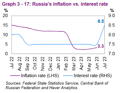 Экономика России продолжила восстановление и продемонстрировала более высокие, чем ожидалось, результаты даже в условиях сохраняющихся внешних вызовов.Последствия восточноевропейского конфликта проявляются в таких показателях, как промышленное производство и экспорт.Денежно-кредитная политика, однако, остается осторожной, и в июле центральный банк повысил ключевую учетную ставку на 1 процентный пункт. Центральный банк России назвал ослабление рубля основным инфляционным риском.К концу июля обменный курс составлял более 90 рублей за доллар США, что означает снижение более чем на 20% с начала года.Потребительская инфляция восстановилась в июне и составила 3,3% в годовом исчислении после 2,5% в мае и 2,3% в апреле, что значительно ниже целевого показателя инфляции центрального банка в 4%.В феврале инфляция составила 11% г/г по сравнению с11,8% в январе.ЦБ России повысил ключевую ставку до8,5% в июле и до сих пор не представил признаков снижения процентной ставки.Более того, уровень безработицы в России продолжал оставаться на очень низком уровне в 3,1% в июне после 3,3% в мае и апреле, при этом общий показатель за первый квартал 2023 г. составил 3,5%.