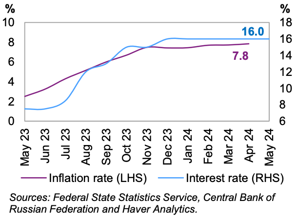 Центральный банк России поддерживал официальную процентную ставку на уровне 16% в мае шестой месяц подряд, причем последняя корректировка заключалась в повышении на 100 базисных пунктов в декабре 2023 года. Несмотря на высокую ставку Центробанка, правительство сохранило субсидируемую ставку по ипотечным кредитам. 8% для широкого сегмента рабочей силы государственного сектора, что немного смягчает влияние высоких ставок центрального банка на жилье. Основным фактором высокой инфляции остаются высокие затраты на импорт из-за внешнего давления в сочетании с высокими потребительскими расходами.