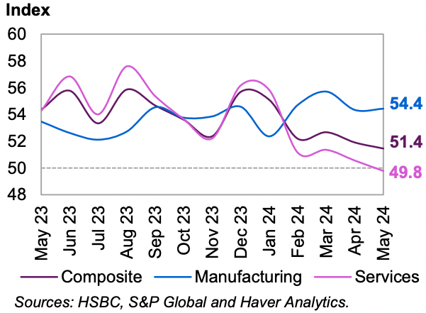 В мае индексы PMI в сфере услуг немного снизились, опустившись в зону спада, в то время как PMI в производственном секторе расширился и перешел в зону роста.