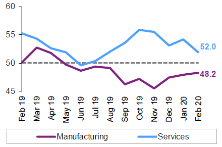 В феврале индекс IHS Markit Manufacturing PMI увеличился с 47.9 до 48.2.