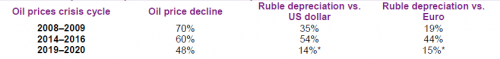 Нынешняя ситуация напоминает 2014 и 2016 годы, когда рубль пострадал из-за снижения цен на нефть. Тогда рубль терял в цене по 3% за каждые 10% снижения цены на нефть.