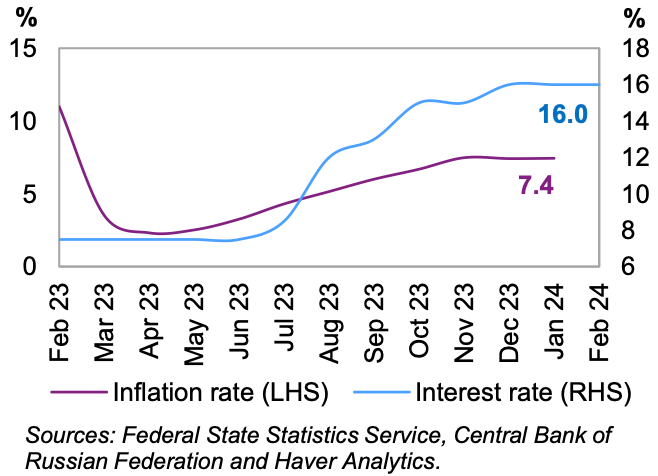 В феврале российский центральный банк сохранил ключевую процентную ставку на уровне 16% третий месяц подряд. Хотя будущее повышение все еще возможно, стабилизация темпов инфляции могла бы ослабить это давление. Однако продолжающийся эффект увеличения потребления домохозяйств может поддерживать инфляционное давление.