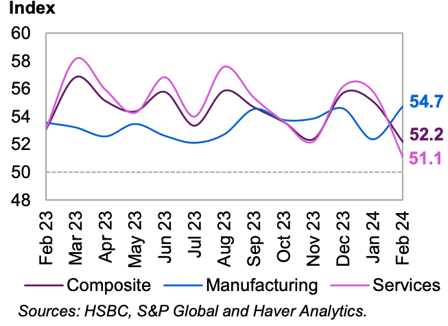 Однако несмотря на это небольшое замедление, цифры по-прежнему указывают на уверенный рост потребления домохозяйств, особенно если принять во внимание базовый эффект от более высокого уровня потребления, наблюдаемого в 2023 году. Сводный PMI снизился до 52,2 в феврале по сравнению с 55,1 в январе и 55,7 в январе. декабре, но остался на территории экспансии.