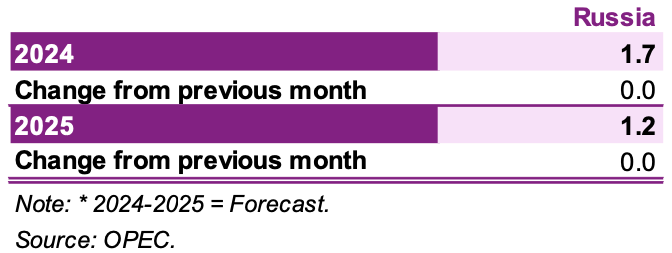 Поскольку улучшение динамики промышленной базы немного компенсируется замедлением, но все еще высокими расходами домохозяйств, прогноз на 2024 год остается неизменным на уровне 1,7%. Существует некоторый потенциал роста, но неопределенность в российской экономике остается высокой.