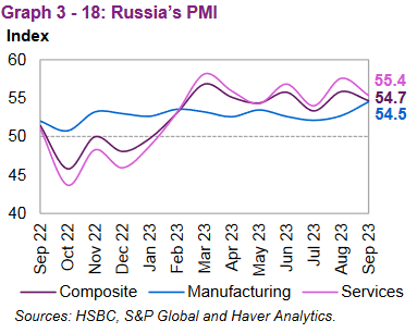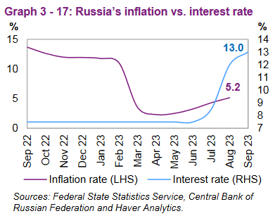 Российская экономика показала лучшие, чем ожидалось, показатели в первом полугодии 2023 года, несмотря на сохраняющиеся внешние проблемы. Рост промышленного производства в августе вырос на 5,4% по сравнению с аналогичным периодом прошлого года. В основном этому способствовало производство, которое в августе выросло на 10,3% по сравнению с аналогичным периодом прошлого года после роста на 9,5% по сравнению с аналогичным периодом прошлого года в июле. В месячном исчислении промышленное производство выросло на 2% в августе, что является максимальным показателем за пять месяцев, после роста на 1% в предыдущем месяце. За период с января по август промышленная активность выросла на 3% по сравнению с тем же периодом год назад. Что касается денежно-кредитной политики, Банк России повысил ключевую процентную ставку еще на 1 процентный пункт до 13% на своем заседании в сентябре 2023 года. В ЦБ подчеркнули, что инфляционное давление в российской экономике продолжает оставаться повышенным. Это в первую очередь связано с ростом внутреннего спроса, превышающим ограниченные мощности, что усугубляется нехваткой рабочей силы, а также обесцениванием рубля.
