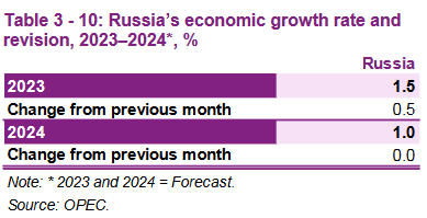 Учитывая продолжающуюся тенденцию к улучшению, экономический рост России в 2023 году был пересмотрен в сторону повышения до 1,5% по сравнению с прогнозом прошлого месяца в 1,0%. В 2024 году прогнозируется экономический рост на уровне 1%.