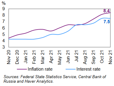Годовой уровень инфляции в России увеличился до 8,4% в ноябре 2021 года, с 8,1% в октябре, что является самым высоким показателем с января 2016 года. В месячном исчислении потребительские цены выросли на 0,96% после роста на 1,11% в предыдущем месяце. В ответ ЦБ РФ повысила ставку на 0,75 б.п. до 7,5% в октябре – это самая высокая процентная ставка с июня 2019 года. Повышение процентной ставки решило проблему инфляции, которая значительно превышает прогноз ЦБ РФ и, как ожидается, к концу 2021 года будет в диапазоне 7,4–7,9%.