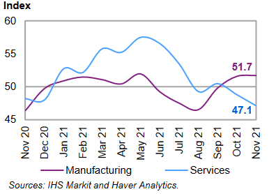 Последние индикаторы PMI сигнализируют о замедлении активности частного бизнеса. Производственный PMI вырос до 51,7 в ноябре 2021 года с 51,6 в предыдущем месяце. Для сравнения, индекс деловой активности в сфере услуг снизился до 47,1 в ноябре 2021 года с 48,8 в предыдущем месяце.