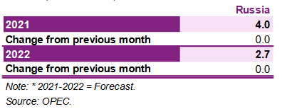Несмотря на повышение общего уровня цен и развитие COVID-19, прогноз ВВП России на 2021 и 2022 годы остался неизменным по сравнению с прошлым месяцем на уровне 4,0% и 2,7% соответственно, чему способствовал рост цен на ископаемое топливо.