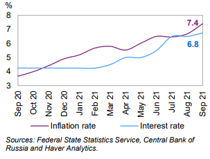 Недавний рост промышленного производства в России снизился с 7,2% в июле до 4,7% в августе в годовом соотношении, отражая сложности в производственных ресурсах. Индикаторы спроса свидетельствовали об умеренном росте, отражающем последствия ужесточения денежно-кредитной политики. Розничные продажи выросли на 5,3% в августе 2021 года после роста на 5,1% в июле. Инфляционное давление продолжало оказывать влияние на восстановление, поднявшись с 6,7% в августе до 7,4% в сентябре. В ответ Центральный банк Российской Федерации (ЦБ РФ) повысил ключевую ставку еще на 25 базисных пунктов до 6,75%. Центральный банк так же повысил прогноз годовой инфляции до 5,7-6,2% в 2021 году и 4,0-4,5% в 2022 году. ЦБ РФ отметил, что мировая экономика восстанавливается быстрее, чем ожидалось, в результате чего спрос на многие ключевые товары превышает предложение.