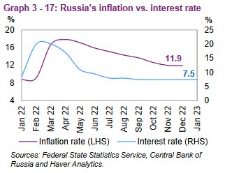 Прогнозируется, что ВВП упадет еще на 8,5% в годовом исчислении в четвертом квартале 2022 года на фоне широкомасштабных санкций, а также введения и воздействия запрета ЕС на импорт российской сырой нефти морским путем.