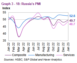 Январский производственный PMI S&P Global почти не изменился и составил 52,6 по сравнению с 53,0 в декабре и 53,2 в ноябре. Индекс деловой активности в сфере услуг восстановился и составил 48,7 в январе по сравнению с 45,9 в декабре и 48,3 в ноябре. Реальный экономический спад в России прогнозируется на уровне 3,5% в 2022 году, что является пересмотром в сторону повышения по сравнению с сокращением на 4,0% в предыдущем месяце.