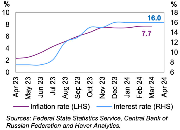 Центральный банк России (ЦБ) сохранил ключевую процентную ставку на уровне 16% в апреле пятый месяц подряд. Сохраняющаяся высокая инфляция в основном объясняется сохраняющейся высокой долей импортных товаров, особенно в секторе потребительских товаров. Ситуация усугубляется ростом доходов домохозяйств, незакрепленными инфляционными ожиданиями, вызванными волатильностью обменного курса, и внешним давлением.