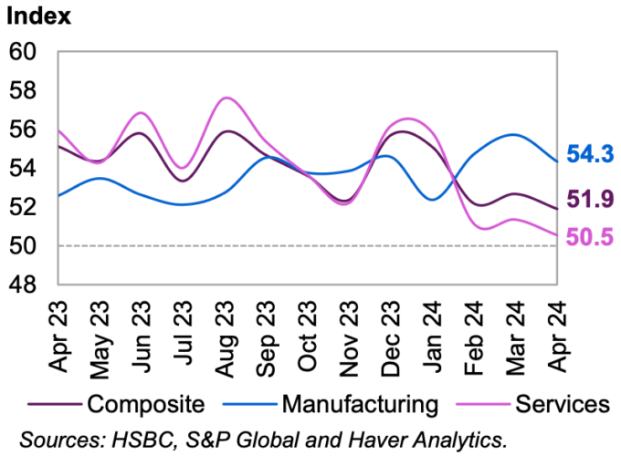Аналогичным образом, PMI в сфере услуг снизился до 50,5 в апреле с 51,4 в марте и 51,1 в феврале.