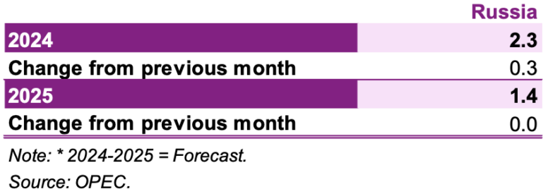 Учитывая высокие темпы роста в 4К23, указывающие на перенос эффектов на 1П24, прогноз экономического роста России в 2024 году был пересмотрен в сторону повышения на 0,3 п.п. до 2,3%.