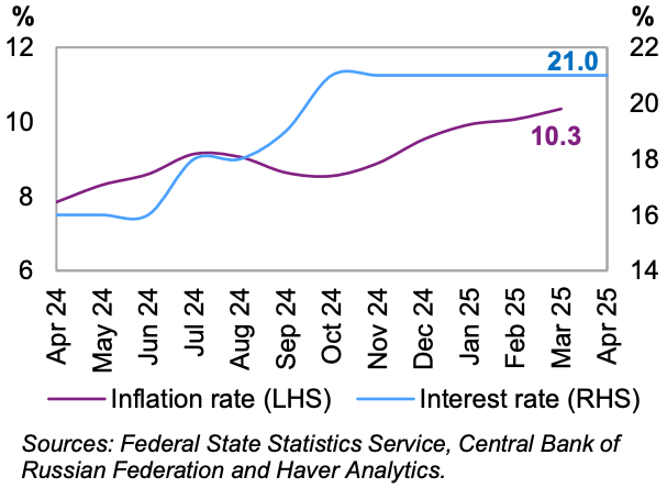 Тем не менее, при уже высоком уровне производства экономическая активность остается на устойчивой траектории роста, хотя с начала года динамика, по-видимому, снизилась. ИП продолжал оставаться на высоком уровне, хотя постепенная нормализация темпов роста стала очевидной. Другие ежемесячные данные за февраль и март также указывают на некоторое смягчение динамики роста экономики. Кроме того, еще предстоит выяснить, в какой степени возможное замедление активности основных азиатских торговых партнеров в сочетании с некоторым ослаблением мирового сырьевого рынка могло повлиять на рост экономики России в первом полугодии 25 года. Кроме того, в марте инфляция еще больше выросла, что заставило ЦБ РФ сохранить ключевую ставку на повышенном уровне.