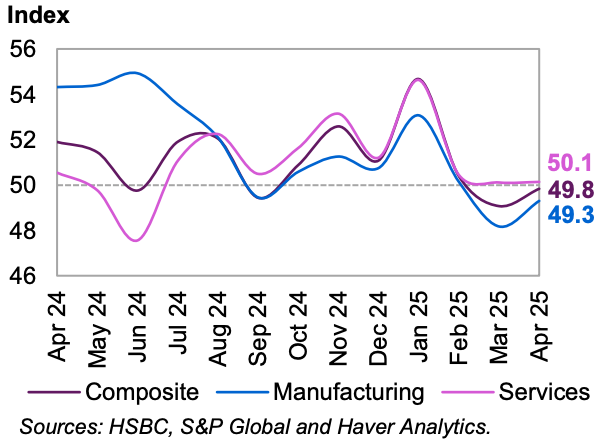 Последние апрельские данные индекса PMI свидетельствуют о некотором улучшении ситуации в производственном секторе и стабилизации ситуации в сфере услуг.