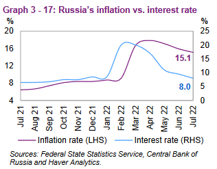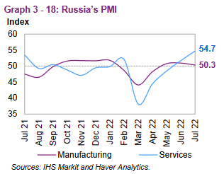Индексы PMI отражали последние тенденции как в промышленности, так и в сфере услуг. Июльский индекс деловой активности S&P Global Manufacturing PMI немного снизился до 50,3 с 50,9 в июне. Между тем, июльский PMI в сфере услуг вырос до 54,7 с 51,7 в июне, что указывает на второй подряд рост в секторе и самый сильный рост с июня 2021 года. С учетом текущих событий реальный экономический рост России в 2022 и 2023 годах остался неизменным: сокращение на 6,0% в 2022 году и рост на 1,2% в 2023 году.