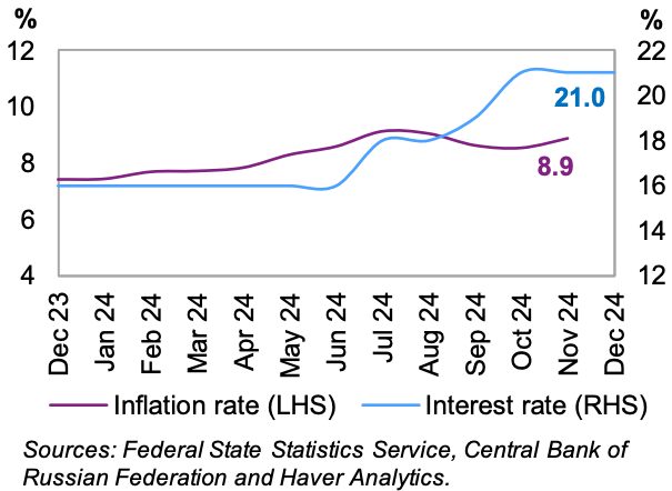 Несмотря на замедление темпов роста, инфляция по-прежнему вызывает беспокойство. Индекс потребительских цен вырос до 8,9 % по сравнению с аналогичным периодом прошлого года в ноябре после трех месяцев снижения подряд. В октябре CPI составлял 8,5% по сравнению с аналогичным периодом прошлого года. Базовая инфляция также выросла до 8,3% г/г с 8,2% г/г за тот же период. В ответ на такую инфляционную динамику Банк России в декабре сохранил процентные ставки на уровне 21 % год к году, приостановив цикл ужесточения, начавшийся в июле 2024 года. Основными факторами, обусловившими решение о сохранении процентных ставок на прежнем уровне, Банк России назвал повышенные инфляционные ожидания, для ослабления которых требуется время, а также значительное дополнительное ужесточение, вызванное ужесточением банковского регулирования и повышением ставок по кредитам.