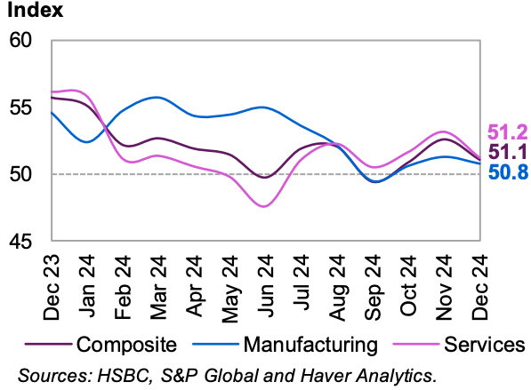 Индекс PMI для производственной сферы снизился до 50,8 в декабре с 51,3 в ноябре, что свидетельствует о продолжающемся увеличении объема новых заказов, однако его темпы снижаются, что сдерживается инфляционным давлением.