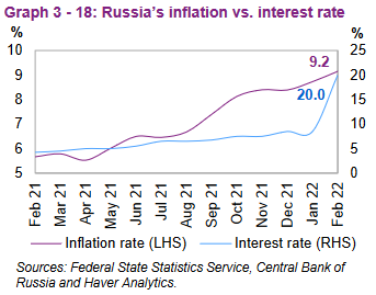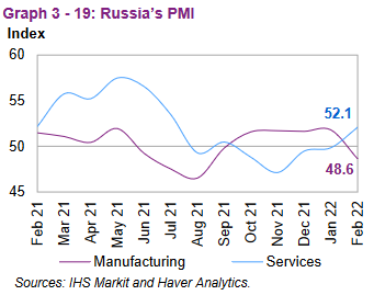 Недавняя геополитическая напряженность может сильно повлиять на краткосрочные экономические перспективы России. Эта напряженность усугубляется беспрецедентным уровнем санкций, введенных большим числом стран. Эти санкции могут привести к значительным экономическим последствиям, включая резкий рост инфляции на фоне дефицит товаров и услуг и обесценение рубля; ожидаемый резкий рост безработицы; и резкое увеличение стоимости заимствований после повышения директивной ставки. Кроме того, после ухода нескольких иностранных компаний выбор потребителей может быть ограничен, что, вероятно, усилит давление на цены и доверие потребителей. Блокирование некоторых российских банков в системе SWIFT может привести к серьезной задержке наиболее необходимых платежей за экспорт нефти и газа из России.