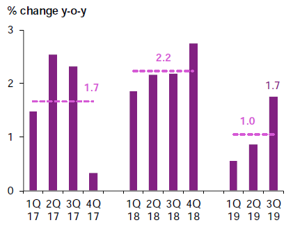 Согласно данным Федеральной службы государственной статистики, рост ВВП в третьем квартале 2019 года составил 1.8%, а во втором квартале — 0.9%.