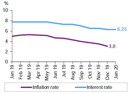 Центральный Банк в январе 2020 года оставил недельную ставку РЕПО без изменений на уровне 6.50%.
