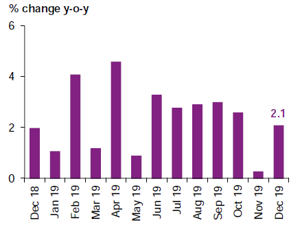 В декабре 2019 года уровень промышленного производства возрос на 2.1% по сравнению с предшествующим годом, а в ноябре — на 0.3%.