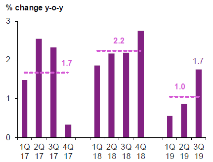 В третьем квартале 2019 года уровень потребления домашних хозяйств был на 3.1% больше, чем в предшествующем году и на 2.8% больше, чем в предшествующей четверти.