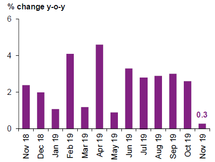 В ноябре уровень промышленного производства оказался на 0.3% больше, чем в предшествующем году; в октябре – на 2.6%; в сентябре – на 3.0%.
