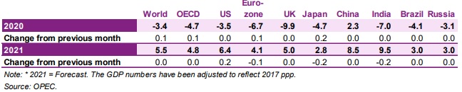 Мировая экономика продолжает восстанавливаться. В США позитивная динамика похоже будет наращивать темпы и во втором квартале 2021 года. ЕС и Япония все еще находятся под давлением локдауна. Если не брать в расчет Китай, пандемия продолжала влиять на рост экономики в развивающихся и развитых странах, особенно в Индии. Благодаря данным уравновешивающим факторам, прогноз роста мировой экономики на 2021 год не изменился и составил 5.5%. Оценка на 2020 год была пересмотрена в сторону повышения, поскольку темпы производства ОЭСР в четвертом квартале 2020 года были лучше, чем ожидалось. Показатель составил 3.4% вместо 3.5% в прошлом месяце.