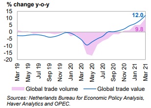 Мировая торговля продолжила значительный рост. Это связано со значительным спадом в прошлом году, а также с продолжающейся динамикой глобальной экономической активности. В марте объемы мировой торговли выросли на 9,8% по сравнению с прошлым годом после роста на 5,2% в феврале, по сравнению с прошлым годом, согласно индексу мировой торговли CPB, предоставленному Нидерландским бюро анализа экономической политики. Улучшилось и стоимостное выражение торговли, увеличившись на 12% (сравнение с прошлым годом) в марте по сравнению с 8,5% (сравнение с прошлым годом) в феврале.
