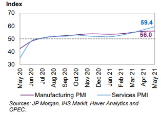 Индекс деловой активности (PMI) в мае демонстрировал постепенную ротацию от сектора производства к сектору услуг. Индекс мирового производства в мае был на уровне 56 в мае, в апреле 55,9, 55 в марте и 53,9 в феврале. Мировой индекс PMI в секторе услуг вырос на 2,5 пункта и составил 59,4, (по сравнению с 57 в апреле). Это довольно сильный рост с показателей 54.7 в марте и 52.8 в феврале.